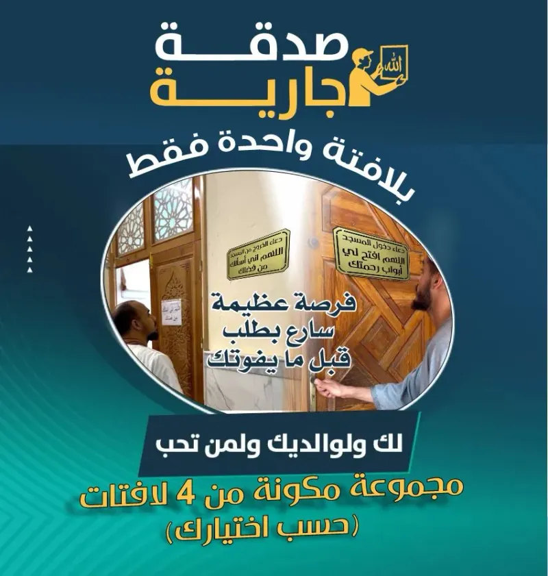 ازرع صدقة لا تنقطع.. بأربعة لافتات أدعية حجم كبير حسب اختيارك بمادة صنع منحوتة على مادة الألمنيوم تدوم لسنوات بحول الله - المجموعة الإعتيادية هي عبارة عن 4 لافتات متعلقة بأدعية المسجد (دعاء الدخول و الخروج من المسجد , دعاء الدخول و الخروج من بيت الخلاء) . و يمكن لك اختيار أي لافتة حسب رغبتك بالذكر الذي تريد مثال (سبحان الله وبحمده، سبحان الله العظيم، صلّ على النبي ﷺ، بسم الله ما شاء الله، استغفر الله العظيم و أتوب اليه, بيت الوضوء مع سهم ,أدعية الوضوء ,أحاديث لتذكير ,شعارات .....) بمادة صنع منحوتة على مادة الألمنيوم تدوم لسنوات بحول الله