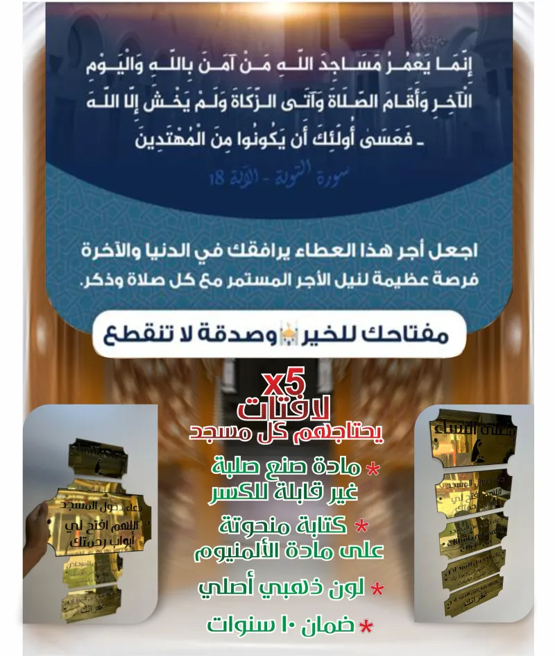 اجعل كل من يمر بالمسجد، يقرأ دعاءً وتحصل على أجره! مجموعة فريدة من 5 لافتات أدعية تشمل: دعاء دخول المسجد دعاء الخروج دعاء دخول المصلى النسوي دعاء المواضئ (الدخول و الخروج)